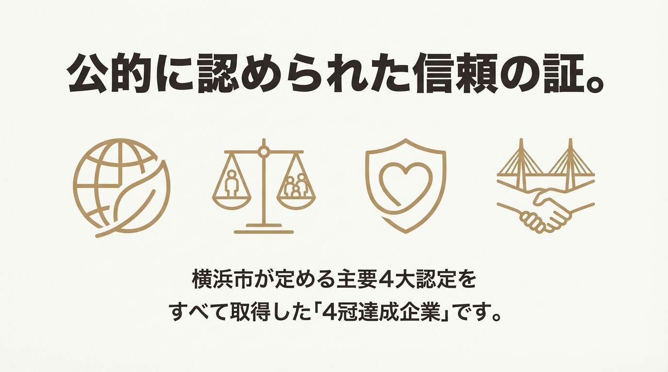 私たちは、横浜市が定める主要な4つの認定制度をすべて取得した「横浜グランドスラム企業」です 。